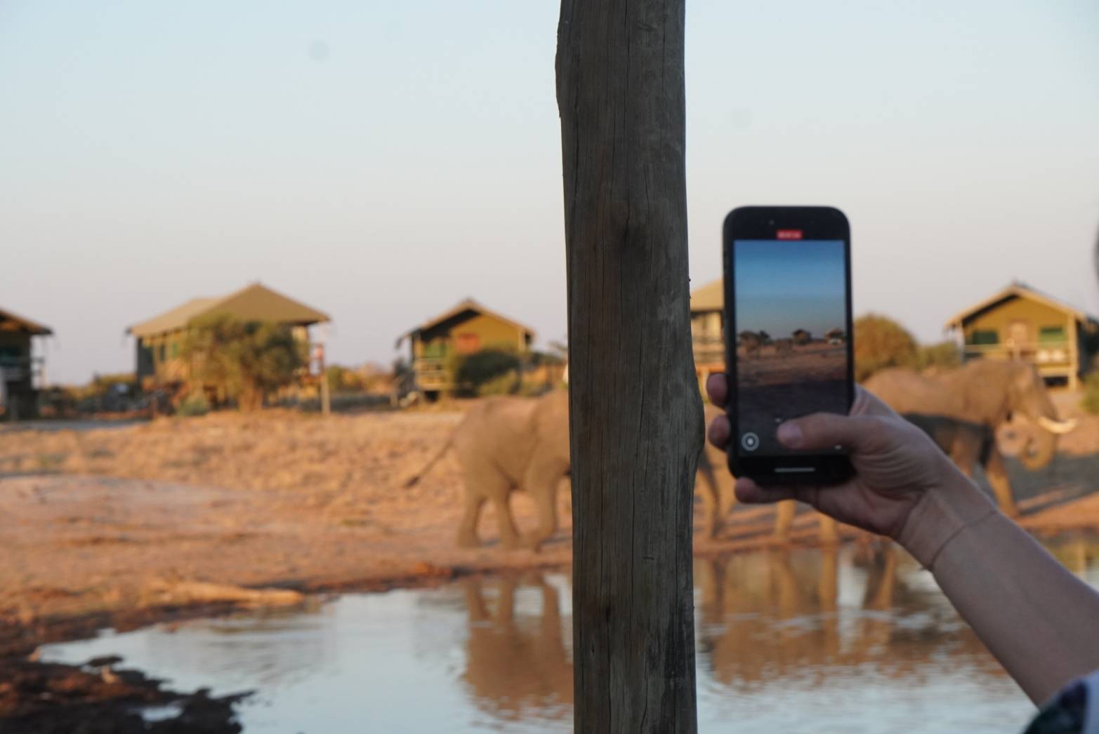 ボツワナキャンプってどんなところだろう?と思っていたのですが、トイレ、シャワーあり、併設されているおしゃれロッジのプール側にあるおしゃれカウチで寝ながら象を待つという